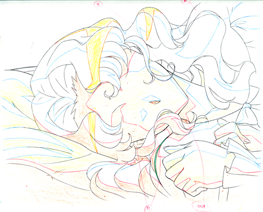 This piece really is amazing - the first layer of this set is A1-End, which is her hair, body, and sheets. However, the eyes are on another layer and the mouth and nose are yet another layer. With this cel comes about 4 sets of mouths, C1-C4 End and the sketches for each of those layers. So all told, the cel has about 6 layers!